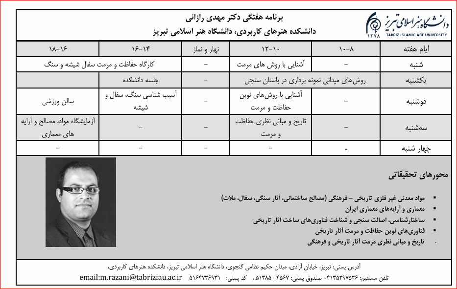 - رازانی،م، تکنولوژی سنگ های سیاه تمدن جیرفت، هفته پژوهش دانشگاه هنر اسلامی تبریز، دی ماه 1390